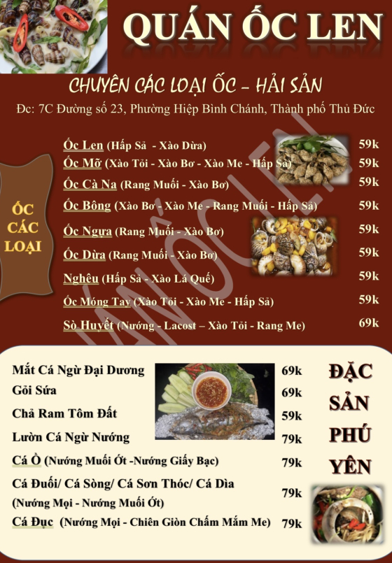 Với 20 năm bán ốc tại Tân Bình, Quán Ốc Len đã xây dựng được lòng tin với thực khách nhờ chất lượng món ăn ổn định, nguyên liệu tươi và giá cả minh bạch. Không chạy theo hình thức cầu kỳ, Ốc Len tập trung mang đến những món ốc quen thuộc, dễ ăn, phù hợp nhiều đối tượng khách hàng.